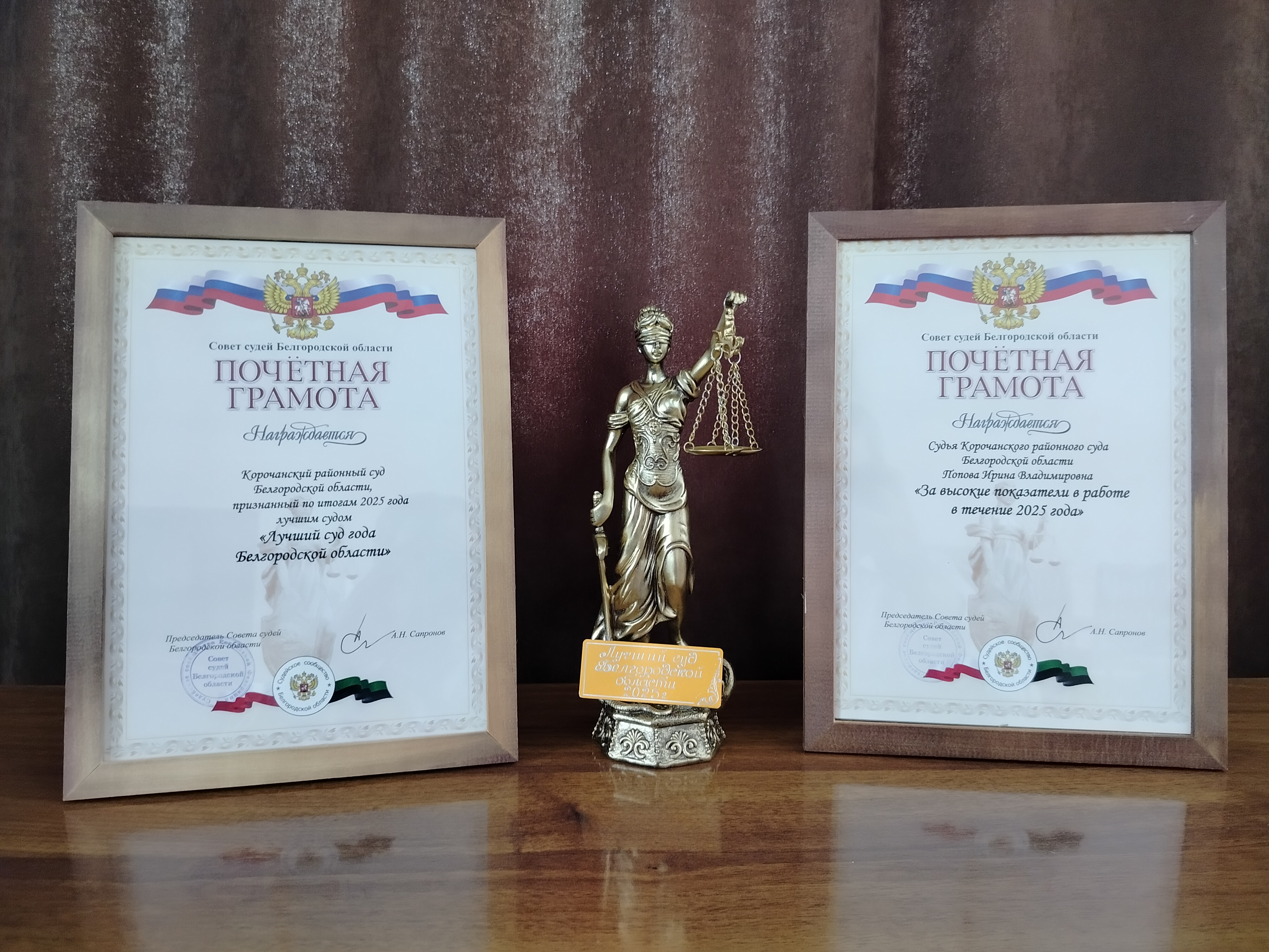 Советом судей Белгородской области объявлены итоги смотра-конкурса на звание «Лучший судья года Белгородской области» и «Лучший суд года Белгородской области». По итогам конкурса Корочанский районный суд удостоен звания «Лучший суд 2025 года» среди малосоставных судов. Также судья Корочанского районного суда Попова Ирина Владимировна награждена почётной грамотой Совета судей Белгородской области за высокие показатели в работе в течение 2025 года. Председатель Корочанского районного суда Петров Михаил Сергеевич поздравил коллектив с высокой оценкой деятельности суда, поблагодарил судей и аппарат за ответственный подход к работе и пожелал им дальнейших достижений в профессиональной деятельности. ![]() |